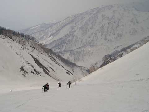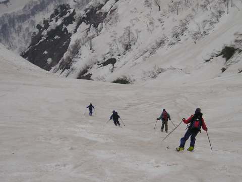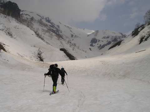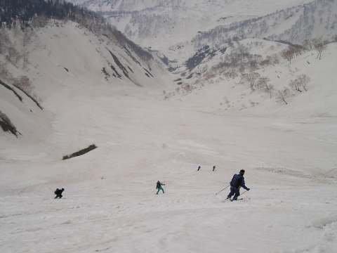 中間部を過ぎると雪面は荒れ、滑りにくくなるが、それでも気にせずに滑っていく。大雪渓を横切り、右岸へ渡る。猿倉荘では除雪作業をしていた。除雪地点まで林道を滑り降り、ここでスキー終了。二股までは黙々と歩く。標高差1800mはさすがに疲れた。