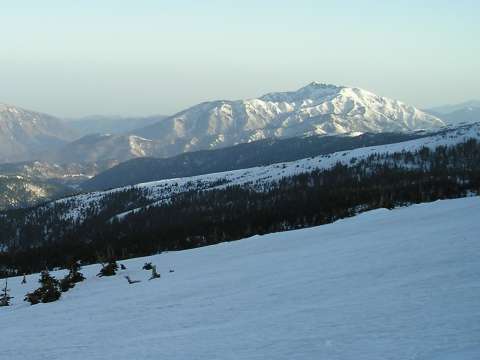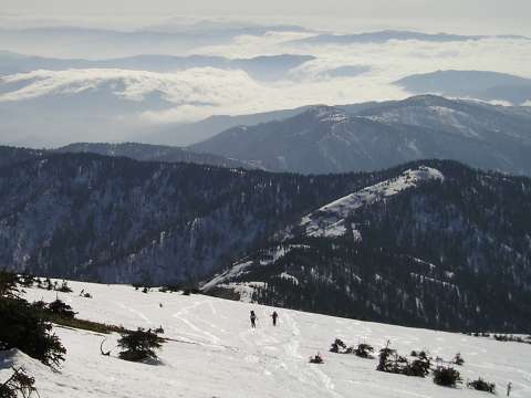再び避難小屋に戻り、今度は薬師沢右俣を滑る。斜度、雪質ともに大満足。高度を下げないように右にトラバースして薬師平に出る。ここから薬師峠へ樹林帯を滑って薬師峠へ降りる。