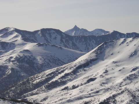 シールとクトーを外して滑降開始。薬師岳が近づいてくる。少し登り返して太郎平小屋、薬師峠へ。ここで再びシールを着けて薬師岳を目指す。今年は稜線の雪が少ない。