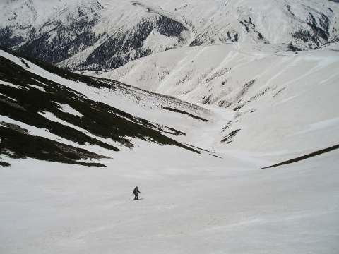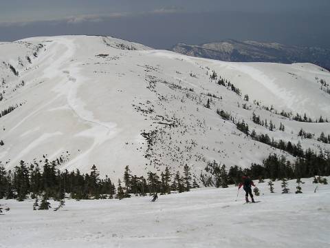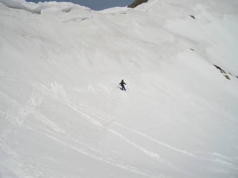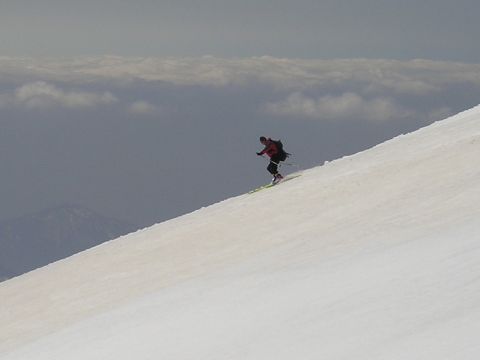 避難小屋からは秋田、上原が中央カールへ滑り込み、櫻井が山頂へアタックする。中央カールは上部こそ傾斜はあるものの、中間部は快適である。150mほど滑ってから登り返す。