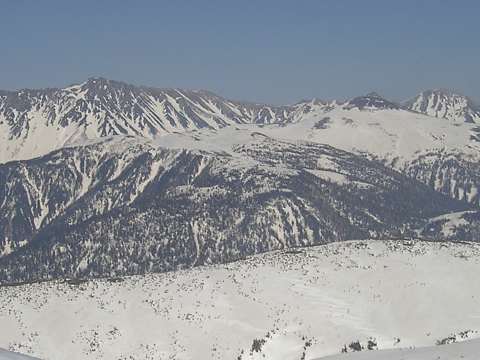 クラストした斜面をクトーを着けて登る。左手には鍬崎山の端麗な姿を仰ぎつつ高度を上げる。北ノ俣岳への稜線には雪がないため北よりに進む。トラバース気味に進んで主稜線に到着。薬師岳、水晶岳、槍ヶ岳など、北アルプスの大パノラマを満喫した。
