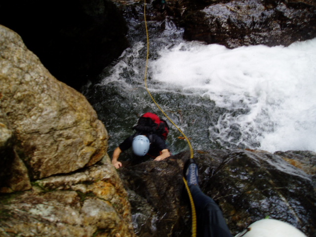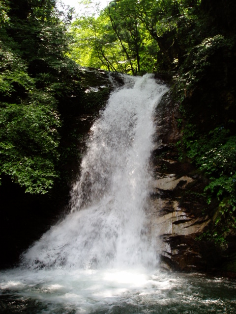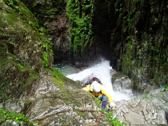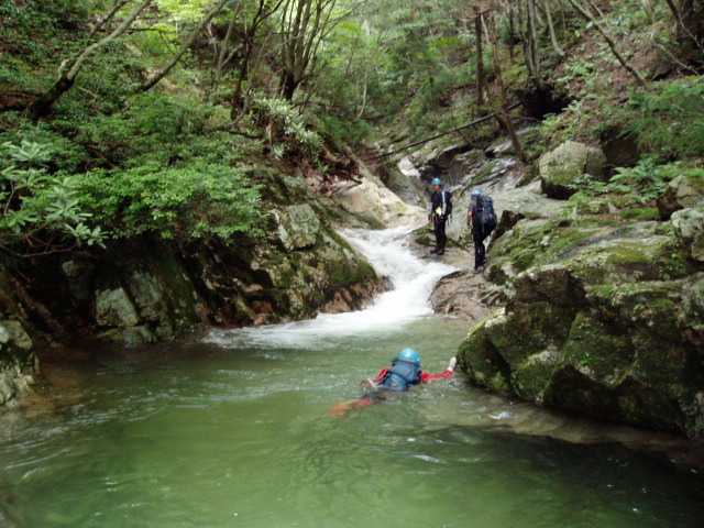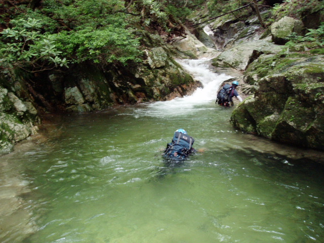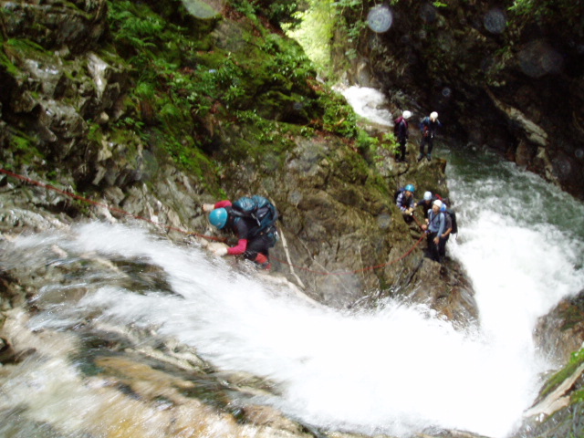 林道を40分ほど歩き、入渓。水量が多いことを言い訳に 過去に登れた滝をパスして軟弱化に拍車がかかる。それでもできるだけ直登をシャワーで楽しみながら遡行し、人数の多さにもかかわらず12:00で遡行終了地点に到着。夏径と林道をのんびり歩いて下山。