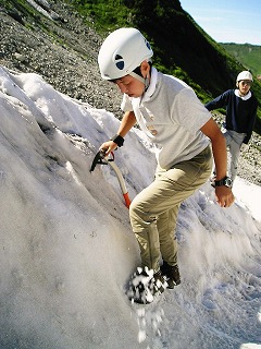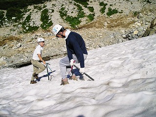 室堂から雷鳥平のキャンプ場を過ぎ、AB隊の5人で寝ぼけ眼で、剱沢を目指します。カンカン照りのよい天気でなんだかのんびりとした歩きです。(今から思えばこの時が一番のんびりしていた)剱沢BCについたのですが、あまりに雪が少なく雪訓をする気力が湧いてきません。1時間ほど昼寝をした後、会長の「雪訓やるぞ!」のお声でよろよろと雪渓に向かいます。しかしながらいつも元気な秋田さんがこの時に限って暑さ+眠さ=体調不良でダウンしてしまい4人でやることになりました。雪が少ないため滑落停止はカットし雪渓でのトラバース歩行、登り、くだり、ステップカット歩行、グリセード歩行をみっちり1時間半程やりました。滑って転ぶと岩田さんの「はい、もう1回」という声がかかるので真剣です。雪渓を走ってくだる練習ではタイムを競いましたがお約束のように村上はおむすびころりんをしてしまいました。