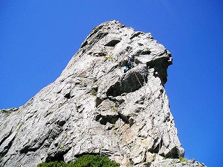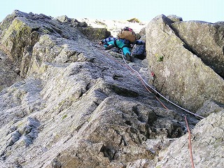 岩田さんが1ピッチをリードしたのだが、全く先行パーティが動かず、更に悪いことにビレイ点が日が差さず、寒い。震えながら待つがどうやら先行パーティがルートを間違え固まっているようです。その間にも先行Pがヌンチャク、ATC,手荷物等を落石ならぬ上からぼとぼと落とし、親切な我々は拾ってあげました。1ピッチ目はまだ体が重く岩田さんも「重量挙げみたいやなあ」と言いながら登っていました。問題の3ピッチ目は先行Pは左へ抜けたようであるが、岩田さんはこまかいフェースを右に少しトラバースしてから直上する。この辺りの岩田さんの岩場でのルートファィンディングはさすがの一言に尽きる。