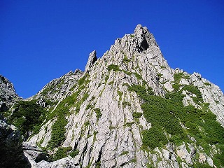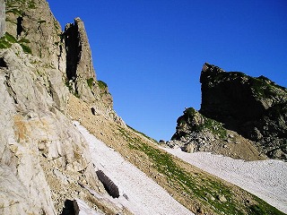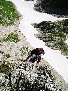 4時半に出発し長次郎雪渓を登る。軽アイゼンが登りはよくきき歩きやすい。まもなく富山大ルートの取り付きに着くが豊川山岳会の3パーティが先行して登っており人気ルートであることがうかがわせます。登りたくても登れず順番を待つこととする。