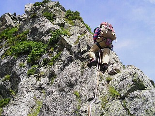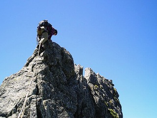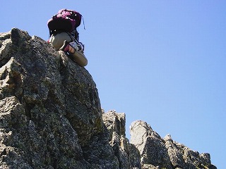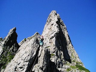 4ピッチ目は斜上バンドを左に上がりリッジに出た。5ピッチ目は村上が今回始めてリードした。ラストの6ピッチ目は柳瀬さんがリードしてDフェースの頭に着いた。ここで硬い握手です。さてここで終わりと思いきや、八ツ峰主稜の縦走がある、六峰から三の窓側へ30Mほど懸垂下降したのを皮切りに七峰、八峰と何度懸垂下降をしたことだろう。八ツ峰の登りでは一部道を間違え、岩場、ハイマツ共にもろい所を登ったのだが、村上がリード中に足場の岩場が抜け落石となりびびった。あれがセカンドにぶつかっていたら? と思うとおそろしい。