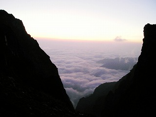 ラストは岩田さんにリードしてもらい八つ峰の頭についた後、池ノ谷乗越に夕暮れについた。やれやれ。池ノ谷ガリーを石を蹴飛ばしながら降りやっとの思いで三の窓についたのはもう18時を過ぎていた。三の窓は2回目だが本当によいところである。夕暮れ時に雲海が押し寄せ日が落ちると満天の星と共に富山市の明かりが暗闇の中に見える。本当にきれいなところである。以前きた時は夜の漁火もきれいに見えたが今回は残念ながらそれは見えなかった。我々はほぼ稜線直下の鞍部にツエルトを張った。この小さなツエルトで3人寝るのも初めての経験であった。しかし・・・待てど暮らせどC隊(飯窪さん、谷岡さん)は来ず、大変心配であった。C隊は剱岳から池ノ谷ガリーまでのどこかでビバークしているのか? 熊の岩か? はたまた剱沢か? 全く連絡が取れず、やきもきした。C隊と合流できなかったのが唯一心残りであったが本日14時間行動し疲れきって眠りに落ちた。明日はすばらしい朝焼けが見られるだろう。剱のすばらしさを実感できるだろうと感じながら・・・・