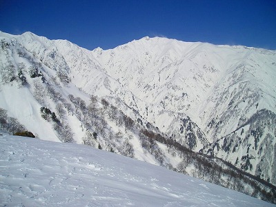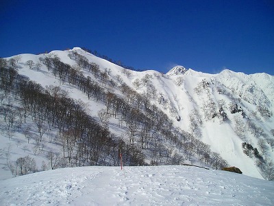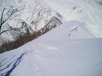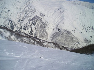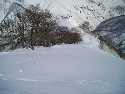 滑降ルートは尾根の左側、北西側の疎林帯を右斜め下へ、尾根稜線からあまり外れないように滑るのが雪質も良く、快適と思われる。八方尾根側の林道からはスノーシェッドの先が特に注意を要し、素早い行動をしなければならないだろう。