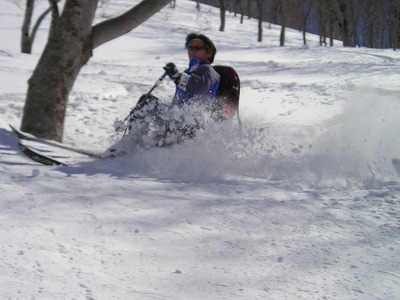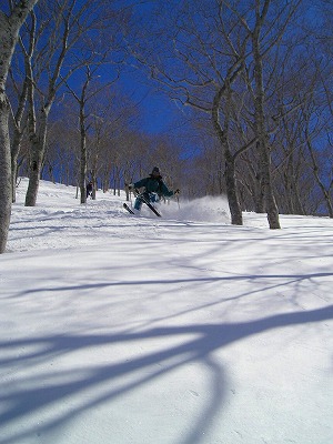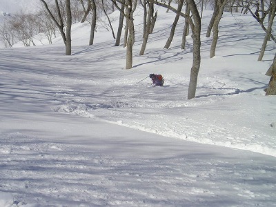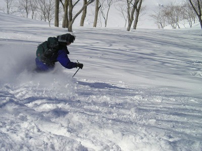 感心している場合ではない、我々も後を追う。疎林帯の中をチョッと重い新雪やけど、みんな楽しみながら滑る。秋田、中尾は流石、滑り込んでいるだけのことはあり、華麗なシュプールを描いて滑る。柳瀬は新雪に慣れてなく、こけまくり?ながらも根性でみんなの後を追う。岩田は新雪を暴走、頭から何度も突っ込み雪まみれ。