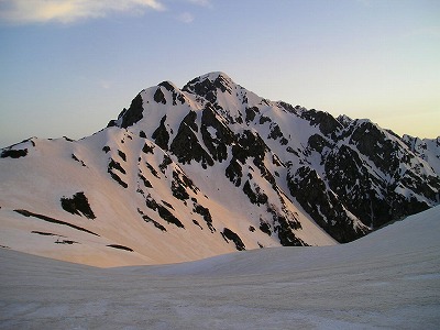 夜明け前、満天の星空。風も静まってきている。登攀・SKIの準備を済ませ、剱沢に滑り込む。幸いバーンでもなく、前日の雨・アラレのおかげでシュプール跡が無い! 朝焼けの中、快適に滑り、源次郎尾根の取り付きヘ。