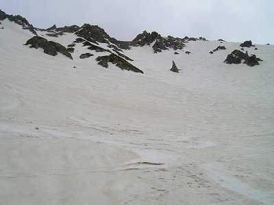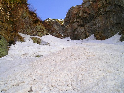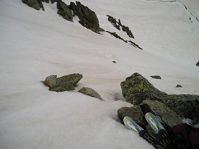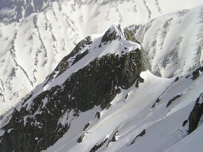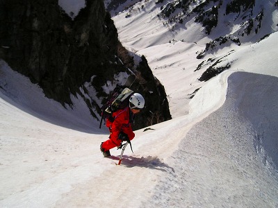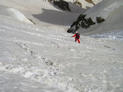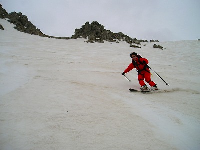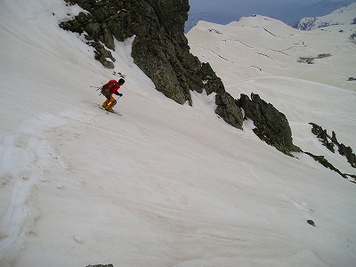 さあドロップ、最初は35度強の斜面、雪の状態が良いので、あっという間にローソク岩まで滑る。雪質は滑る程、重たくなるが全然問題にならない。広い斜面を思いっきり飛ばす。登り3時間、下りは30分。