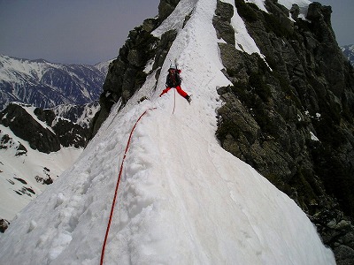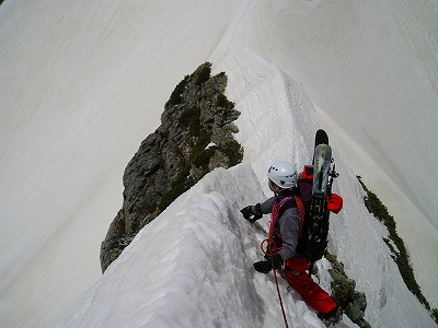 1人、山頂から滑降し、直後、転倒。体は50m程流され、SKIの1本はラッキーにも山頂直下で止まっていた。お~、こわ。私達は長次郎のコルへ。コル手前が60度はあろうかと思われる50m程の下りで、ザイルを出してもらいバックで降りる。