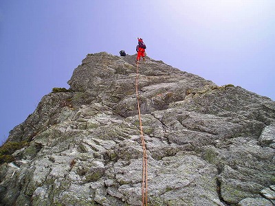 いよいよ、登攀開始。ルンゼもアイゼンが良く効く。しかし、約45度の傾斜に、延々と続く登りでこたえる。尾根に出て、ハイマツ帯の岩場を登っていく。雪と違って、グイグイ登っていく感じはいい。