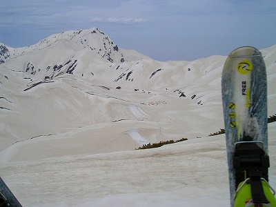 5月1日は真砂沢を滑る予定であったが、昨日の13時間行動の疲労が残っているのと、剱沢の上り返しがしんどいので、とりあえずベースを雷鳥平に移すことに決め、テントを撤収する。また雷鳥平には関東の方々が居られ、酒とひょっとして松阪牛があるかもしれない・・・。