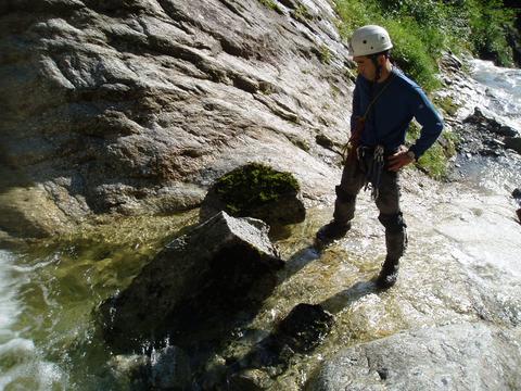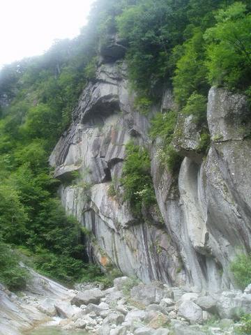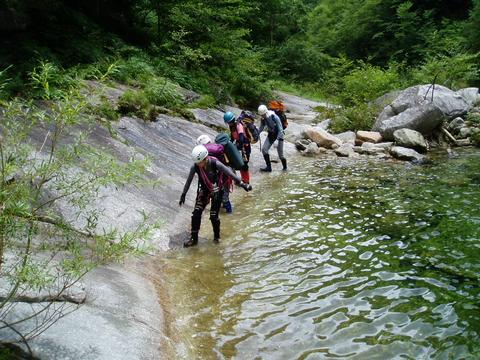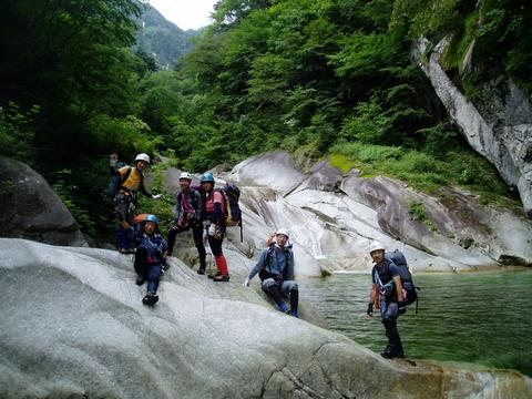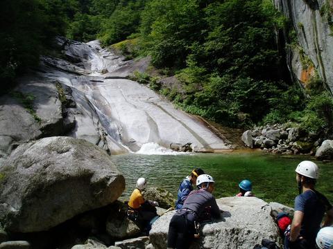 入渓地点下流部では別パーティーが竿を出していたが釣れるのだろうか。天候はそれほど悪くはなさそうで、さすがに本流であるためか渓相も花崗岩帯の沢床で広くて明るい。遡行開始してすぐに大釜を持ったナメ滝が出てきて各人思い思いにヘツリながら大釜をかわす。岩質はツルツルに磨かれておりフリクションが効き辛い。