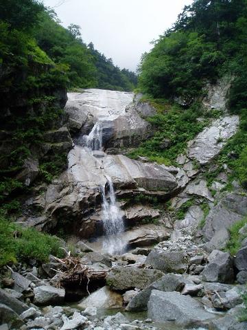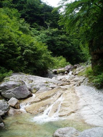 滝身の左からフリーで取り付くと一段目はスンナリ登れ、後続をお助けロープで引っ張る。二段目以上は照代の登るのは嫌だという意見であっさり左の巻き道を使う。途中一人で上部のナメ床へ戻り遠景を望む開放的な渓相を楽しむ。