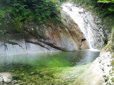 その後出てくるナメや滝を慎重に足を運びながら順調に遡行する。どの滝も直登困難なスラブ状のナメで、大きくて深そうなエメラルドグリーンの釜をたたえていた。一部巻道にいやらしい箇所もあったが、やはりというか泊りの沢の場合はやむを得ない場合を除いて大胆に泳ぎにはしることができず、ヘツリや巻きで済まそうとする自分は完全に守りに入ってる山行スタイルの持ち主だ。