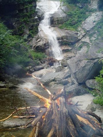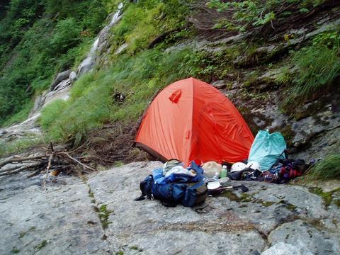 早速、薪をかき集め焚火を起こし、食事準備をしているとタイミング良く?雨が降り出した。夕立らしく本降りとなるが焚火を消さないように薪をくべていると坊主ノ滝が異常に増水していることに気付き、あっという間に焚火の下にも浸水。それでも火は消えず、水流の上の焚火という異様な光景となった。テントにも間際まで水流が押し寄せて来たため、土木工事で水路を構築して水を逃がす。