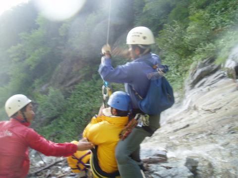 7時を2分ほど過ぎた頃、ヘリの音が聞こえ始めた。すぐに谷底に張り付くようにヘリが現れ、坊主ノ滝下での女性陣のテン場付近でホバリングしていたので現場はこちらだということを黄色のツェルトを大きく振って知らせる。ヘリがこちらに向かい始めると同時に荷物を飛ばされないようにまとめ、ダウンウォッシュからの暴風態勢をとる。ヘリが真上でホバリングを始めると爆音とダウンウォッシュによる水しぶきで目を開けていられない。救助隊員の一人が下降してきてH氏に浮輪のような全身ハーネス?をすばやく装着させ、2人同時にウインチでピックアップして収納と同時に飛び去って行った。この間5分とかかっていない。ホバリングしているヘリ機体底部の認識番号は読み取れたが、逆光で県警か民間かの識別はできなかった。