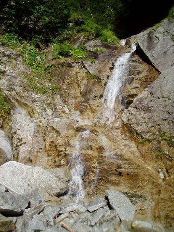 会長と2人急に静かさが帰ってきた谷間で残された彼の荷物を前に暫らく脱力感で呆然とした。気を取り戻し、下山にかかる前に崩落事故のあった滝を観察することにした。取り付きから5mほど上部水流の左側岩盤が剥離した跡として見ることができた。ほとんど滝壷が無い滝の下にある砕けた真新しい岩盤の形状からみて間違いないだろう。しかし、よく見ると左の嫌らしそうな草付気味の岩盤より右側のほうが登り易く見えるのだがどうしてあえて左を登ったのだろうか?
