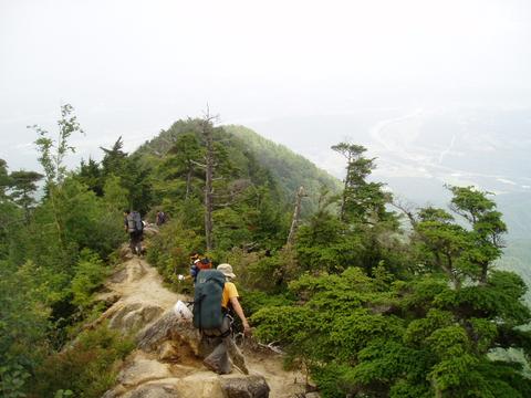 大きく裂けて使い物にならないH氏のザックはその場に放置してその他の荷物を自分達のザックに詰め込み皆の待機する坊主ノ滝下まで尾根通しで下降をはじめる。昨日はバンド状の岩壁に阻まれ懸垂下降をしたがもう少し尾根の上部まで登ると現場までの下降路があった。坊主ノ滝左岸のルンゼに降り立つと女性陣に向けてホイッスルを鳴らして戻って来たことを告げる。テン場に到着後、荷物を皆に分散して5合目から黒戸尾根に上がるべく白稜ノ岩小屋を目指して今年の夏合宿は終わった。白稜ノ岩小屋からは急登を上り、五合目避難小屋から長い下りを照代を先頭に駆け抜ける。