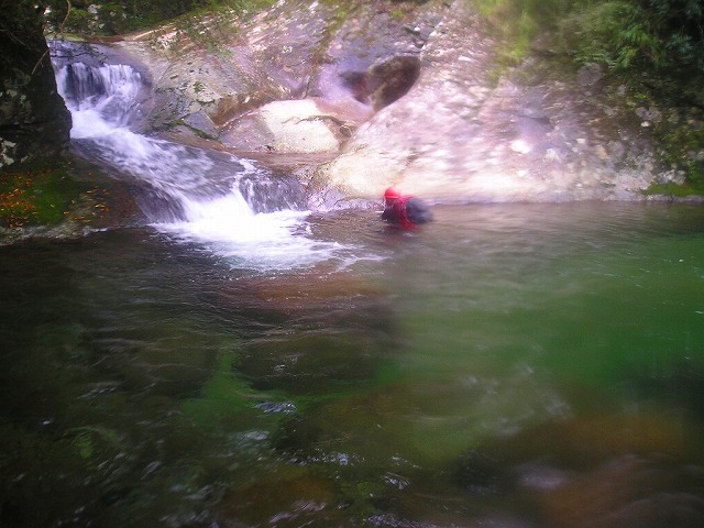これを右に巻くとインターネットの遡行図では中華ナベの淵と書かれていたのでどんなのかと思っていたら、外国のバスタブをひとまわり大きくしたくらいの確かにきれいなすり鉢状の淵だ。今日も気温はそれほど低くない。おあつらえ向きの滑り台からナベに向かって何度も水に浸かって楽しんだ。ここで村上さんの分析「これが蛍雪の沢のコースタイムが長い理由や…!」
