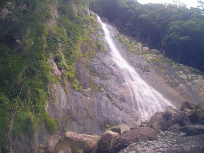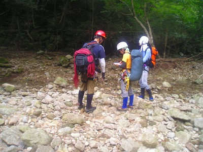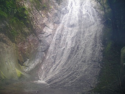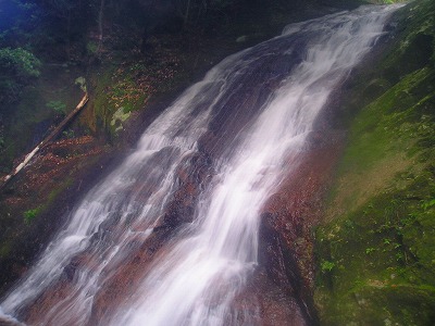 二日目5時起床の目覚ましが鳴っても誰も起きない。少し薄明るくなった頃誰とも無しに起床。柳瀬さんの様子がおかしい。虫に刺されて目の辺りがはれている。そう言えば寝ている時手の甲や指、すね、額と所構わずかゆかったが…。鋼鉄の皮膚を持つ岩田さん以外は皆刺されて小さな赤い点がぽちぽちと点いている。蚊取り線香の効き目にも限界があったようだ。柳瀬さんのいれてくれたチャイで気を取り直して大量うどんを皆で平らげ出発。朝のためか昨日よりは少し曇っているようだが天気はおおむね良好そうだ。程なく屏風滝の掛かる沢へと分かれる二股。屏風滝の見物は省略してやや進むとすぐに牛鬼滝へ。水が直接滝壷に落ちずにほぼ垂直の岩壁に水しぶきを上げながら末広がりになって落ちている。