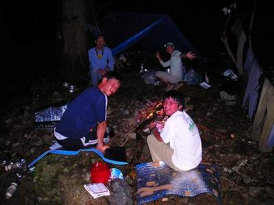 早速これも途中調達した大きなタープ(ブルーシート)を張り、食事の準備、焚き火の枝集めをする。苦労の末焚き火に火が点く頃ようやく薄暗くなってきた。今日はほとんど水に濡れず遡行中それほど寒さを感じる事は無く、陽が落ちてからも焚き火近くにあたると暑く感じる程だった。ビールで乾杯後、岩田さんのスルメをあぶりながら、蛍雪定番の豚キムチと鍋をつついて至福のひととき