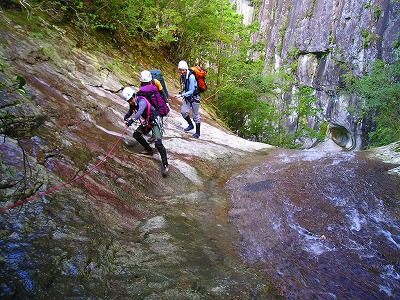 ここから1間先の角を曲がる度にとでも言いたくなるように立派な滝が息付く暇もなく連続して現れた。その最初の50m滝。右岸左岸共に巻ける様だったが、今回行った左岸の立った川岸を潅木を頼ってのトラバースは中々いやな感じだった。少し慣れてない人がいる時にはフィックスを張った方がいいかも知れない、と他の記録にもあったがそう思った。その後巻きからナメっぽい滝の落ち口に降りる場所で一箇所ザイルをフィックスしてヌンチャクをかけて降りた。