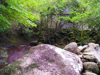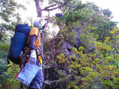 その先の50m滝は右岸の巻き道が小さな陵線をたどり、丁度登ってきた谷を見下ろす事ができ、熊野川まで見える風景としばしナイフリッジの陵線歩きを楽しんだ。また沢に戻りしばらく行くとぼろぼろのプレハブの植林小屋に出た。半ばナメ床の上に石垣を作って立てた小屋だが、ビンや使っていた荷物が捨て置いたままになっている。