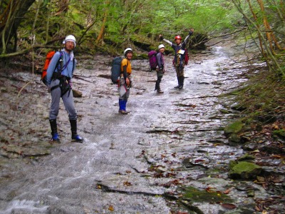 これを越えしばらく変化のない沢が続く。しかし先には1000mのナメが待っている。我慢強く沢歩きを続け、いよいよ水のないガレた支谷を左に見送ったすぐに、今回のメインお待ちかねのナメが見えてきた。想像よりは少し傾斜があり、入口に当る斜瀑からそのまま続く滑り台のような川床をひたすら登って行く。途中やや傾斜が緩くなってきた。