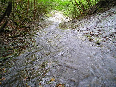 記念写真も撮り終え、下山。ほぼ全て沢伝いに付いている登山道で迷っている記録が多い事もあり、あのナメを下降に使う事にして、もと来た道を戻り無事ナメに到着。あの傾斜を下るのかと思っていたが難なくクリアし植林小屋へ。ここからは登山道を辿って山頂からあわせて2時間の下りと言う情報だったが、登山道が尾根に上がるあたりまであったテープが無くなり、もともとほとんど作業道のような登山道を見失ってしまう。ケヤキ平に流れ込む枝沢沿いに登山道が付いていると言うことなのでこの枝沢目指して植林された尾根を下る。