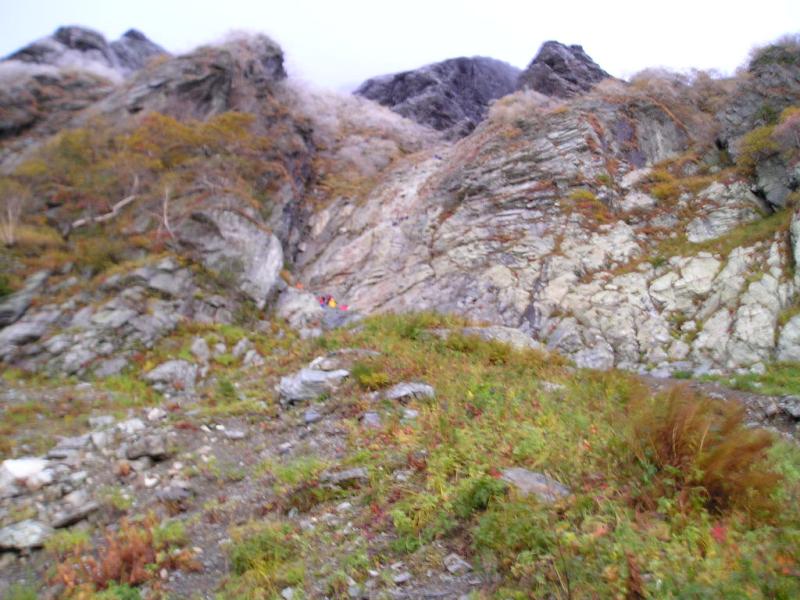 bガリーとCガリーの間の尾根状を登るとbガリー大滝の取付きには大勢のクライマー(10名以上)が登攀の