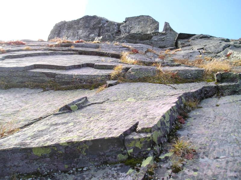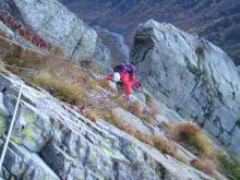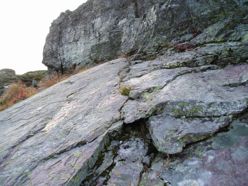 四尾根からガイドさんがルートを教えてくれたが、もう下に降りてきたので左のバリエーションルート(Ⅴ)を登ることにして、左のスラブに打たれたボルトテラスに移る。