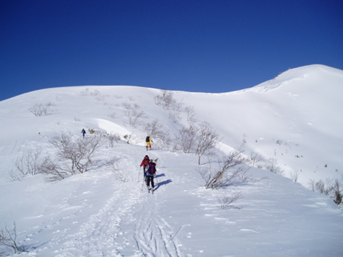 山頂で小休止の後、南面に滑り込む。日が当たっているのでベタ雪かと思ったが、思いの外快適な滑降ができた。ここからは春山のような日差しのもと、山頂へ登り返す。