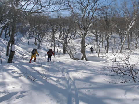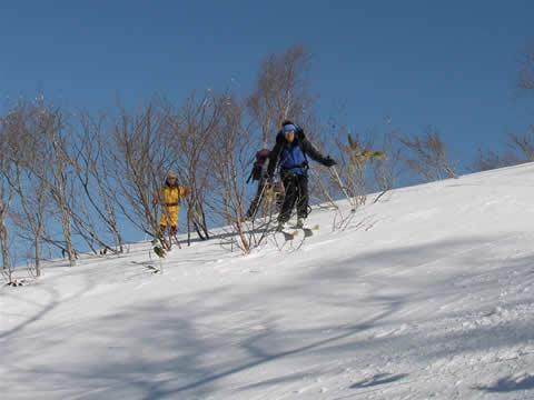 ゲレンデに戻る松村さんと別れ、北東面のかます谷を滑る。意外なことに、ここがいちばん快適だ。最初にここを滑れば良かった。滑降を楽しんだ後はトラバースぎみにゲレンデ上部に戻る。ところが先行者に導かれるようにゲレンデ脇の沢を滑り、少し迷いながらゲレンデに戻った。