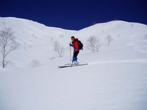 最初は西面を滑ろうとしたが、ヤブが多いために北面の大日谷に変更。パウダースノーを期待したが、雪質が重く、快適とは言えない。200mほど下ってから引き返す。今度は西面の別の沢を滑る。こちらも雪質が重く、早々と引き返す。