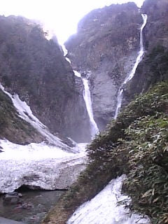 上市駅まで車で送ってもらい、5:34の始発で立山駅へ向かう。途中乗り換えると電車は満員で、立ったまま立山駅に到着。称名滝行きのバスは1時間40分ほど待ちがあったため、タクシーにて移動した。途中、タクシーを降りて見た、称名川の川向うに500m近い高さの長い切り立った壁面は、迫ってくるようで圧倒された。その後、展望台で称名滝の水しぶきを浴びてから、いざ大日岳登山道へ(8:30)。