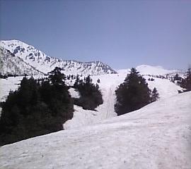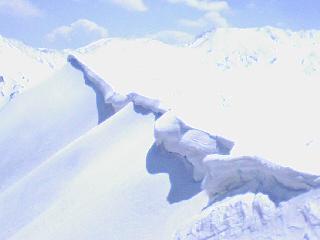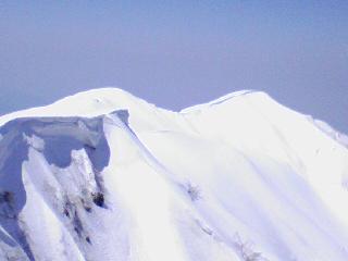 牛首を過ぎて左に(ザクロ)谷を見ながら登るが、足元と谷には結構な高低さが感じられ、踏み抜いてしまいそうなところもありこわごわ登る。この辺りからは一面雪景色で、薄手の長袖にTシャツでちょうど良かった。