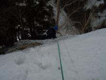 テントの撤収を会長と吉田さんにお願いし、藤本さんと先行する。昨日のFIXを利用して急雪壁を越え、さらに1ピッチFIXしてニードルの基部まで行く。ニードルは残置FIXに騙され、会長のリードで池ノ谷側を巻いたが、下り気味のトラバースが結構怖い。あとから分かったのだが、正面からニードルのピークまで登り、白萩川側の雪面を下るのが正解だと思った。次のドームは仙人谷側の雪壁を登る。