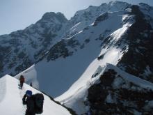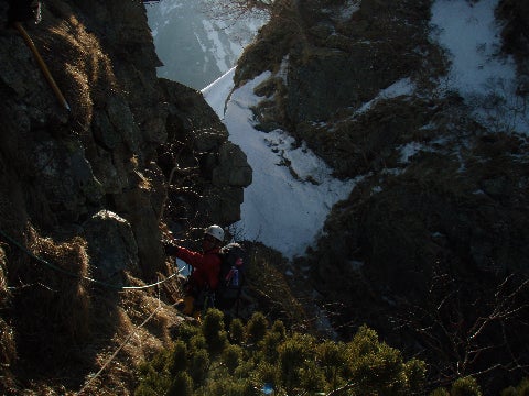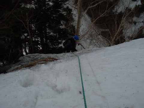 カニのハサミと2700m?の下りの2回FIX、獅子頭を池ノ谷側から巻く部分も、ザイルを出しても良かったかもしれない。ここの部分は雪庇の真下を通るので恐ろしい。