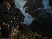 ピラミッドは1ピッチザイルを出して、池ノ谷側から登る。マッチ箱は2ピッチで岩稜帯を抜けたあと、1ピッチ氷の載った岩場にFIXして左斜上、さらに白萩川側のクロアールにザイルを出して登り尾根に出た。このあたりの部分は、他パーティの順番待ちで時間をとられる。