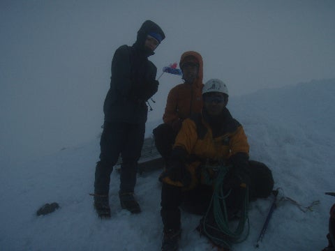 20分ほどの登りで本峰に着き、記念撮影するがこれからの下降が気にかかる。幸い、カニのハサミのクロアールを降りるときには視界が回復してきてくれた。
