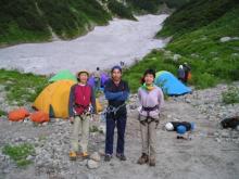 暑くて風も吹かない仙人池新道を下り、ふらふらになって真砂沢に着くと関東の加藤さん達がテントの中に居られた。岩田はふらふらだが柳瀬さんは元気で今日中に剣沢まで行きたい様子、これはたまらんと加藤さんに目配せして「今日はここに泊まりなさいよ、宴会しましょうよ」と柳瀬さんを説得してもらう。作戦はまんまと成功、我々もテントを張りその夜はたっぷり美味しい料理とお酒をご馳走になりました。(岩田は狭いテントの中で諸先輩を差置いて横になってしまい申し訳ございませんでした。)