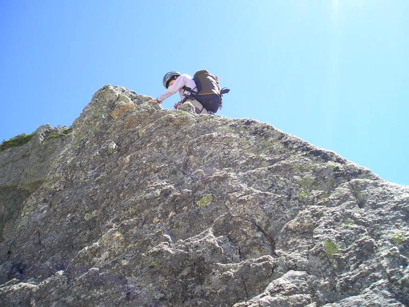 追い抜くときのルールとして、了解を得て既存ルートを先に行かせてもらうか、登攀ルートの別ラインからロープが交差しないように、登攀ルートのランニングの残置支点を基本的に使わないように並行して登るのが常識ではないか! 当然、先行パーティの了解を得て・・・。チョッと嫌な気分になったが、上部の素晴らしいナイフリッジを登る頃にはその事も忘れ気持ち良く登攀を終了することができた。