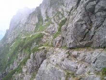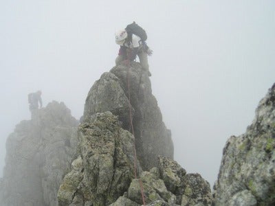 Aフェースの頭からVI峰の頭に向かおうとするが踏み後が分からないので、再度V VIのコルまで40mの懸垂×1で一旦降りてから登り返す。VI峰からはクライムダウンと懸垂×1で水平道に降り、八ッ峰と別れ三ノ窓を目指す。