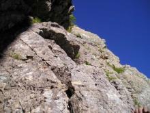 1P目、8mのフェースを登りハーケンに導かれハング?を越える(IV)、右上しレッジに立ち、左の這い松バンドでビレー。(35m IV)