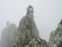 5P目、左のルンゼを登り左稜線T5下のピナクルの取付きへ出る。(8m II)しかし、ここは左稜線大渋滞のど真ん中、後続のパーティの前に割り込ませてもらう。結局ここで2時間近く待つはめになってしまった。最近の傾向として、どの岩場でも人気ルートのみに集中(北岳であれば第四尾根、)して他のルートを登らない、なんでやろう?