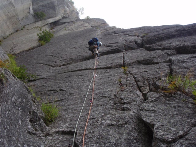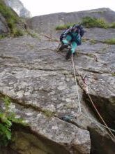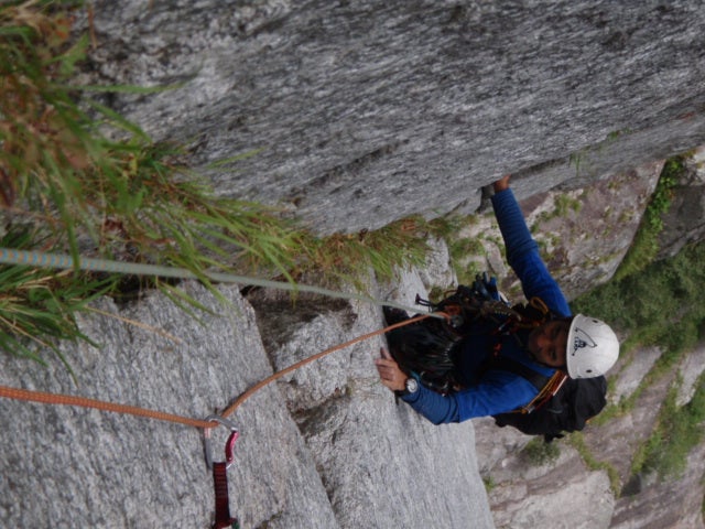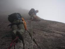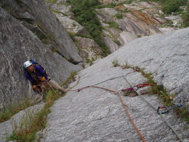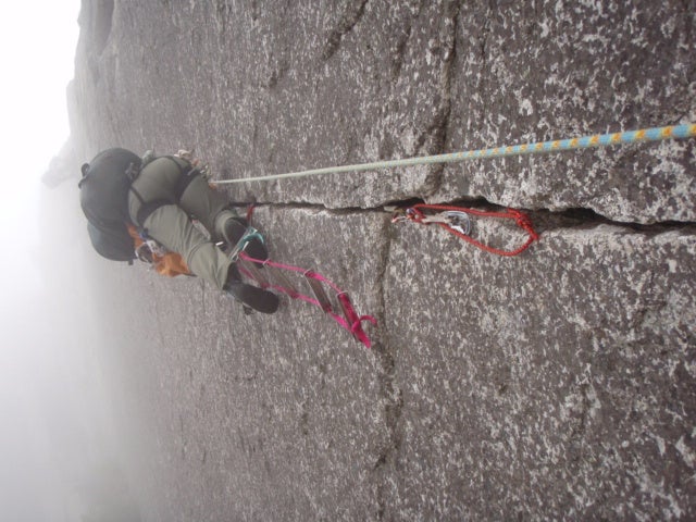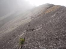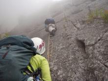 7P目 恐竜カンテを右に越え、高度感満点(天気が良ければ)のボルトラダ-を直上するが、セカンドが登攀中に心配していた雨がとうとう降って来た。ビレー点で大慌てで雨具を着る。後続のセカンドはまだ6P目を登攀中、雨はやみそうにないので、安全第一で全員がロープで繋がって登ることにする。飯窪は雨具が着られなく、濡鼠で登ってくる。