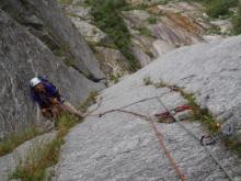 1P目 最初のピンが抜けており、フレンズをセットしハングを越すが、2ピン目までとどかない(岩田の身長163cm)、セカンドのショルダーの助けでどうにかとどいた。
